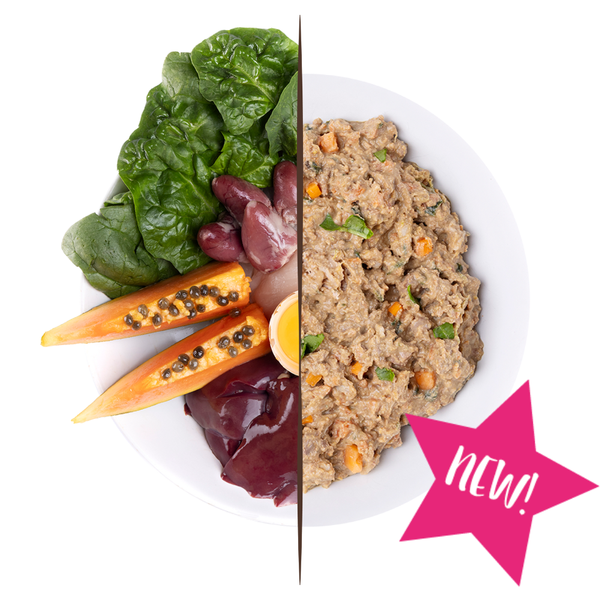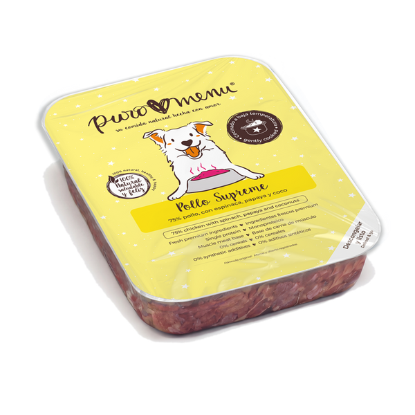 Composición: Carne de pollo (32,5%), zanahoria (16%), corazón de pollo (15,4%), mollejas de pollo (12,6%), piel de pollo (8,4%), hígado de pollo (6%), espinaca (2,4%), papaya (2%), coco (2%), semillas de lino, yema de huevo, cáscara de huevo, aceite de hígado de bacalao, algas marinas (ascophyllum nodosum), germen de trigo sarraceno