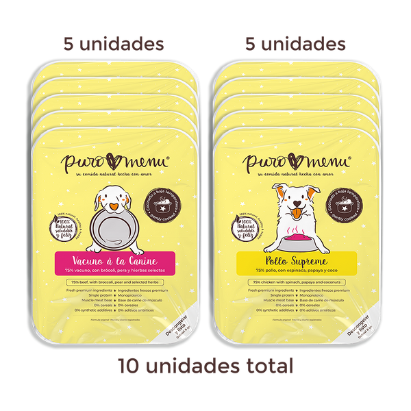- El pack contiene 5 paquetes de Pollo Supreme, muy suave y digestivo, y 5 paquetes de Vacuno à la Canine, nutritivo y delicioso